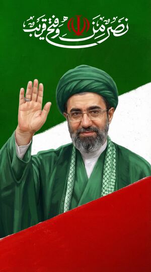 Like many other clerics, he had an independent political personality and did not join any political party or group, but he is a person who is informed about politics and possesses political insight. For this reason, he served as a sincere assistant and advisor to his martyred father, accompanying him and learning the methods of leadership of the Islamic nation. It is hoped that his leadership will mark a new chapter in pursuing the lofty ideals of the two previous leaders of the revolution, and that the great grace of the Almighty and the last divine proof, Imam of the Age (may Allah hasten his noble advent), will include him and the God-seeking and Velayat-oriented people of Islamic Iran.[1]